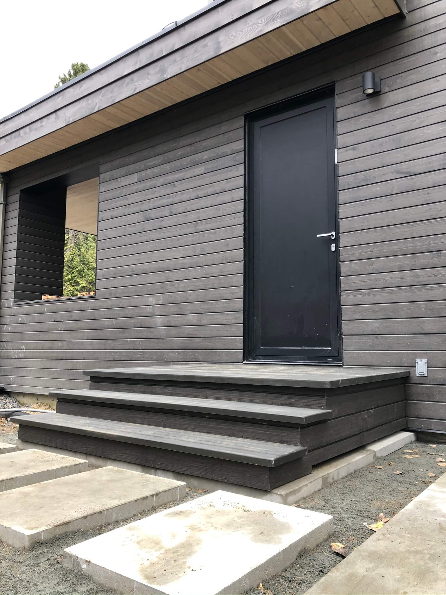 Enfin, nous avons réalisé un petit balcon-terrasse et ses marches à l’aide d’un revêtement en fibre de verre d’ingénierie provenant des Produits Balcotech inc. La couleur bois antique s’agence parfaitement avec la façade de la maison.