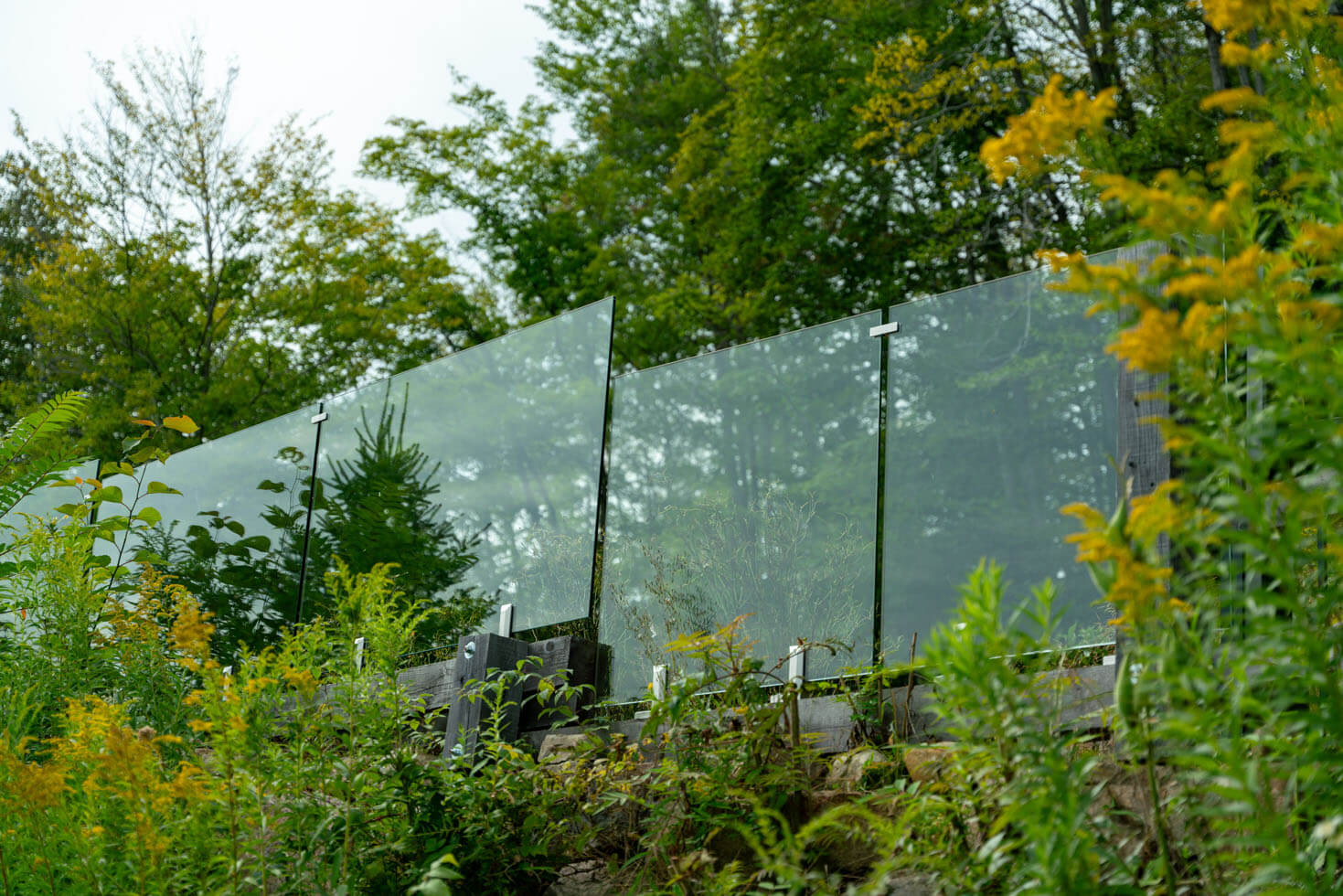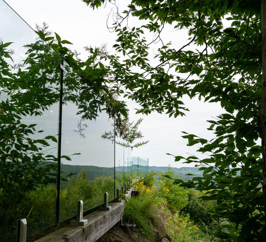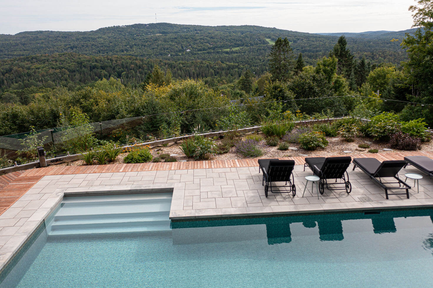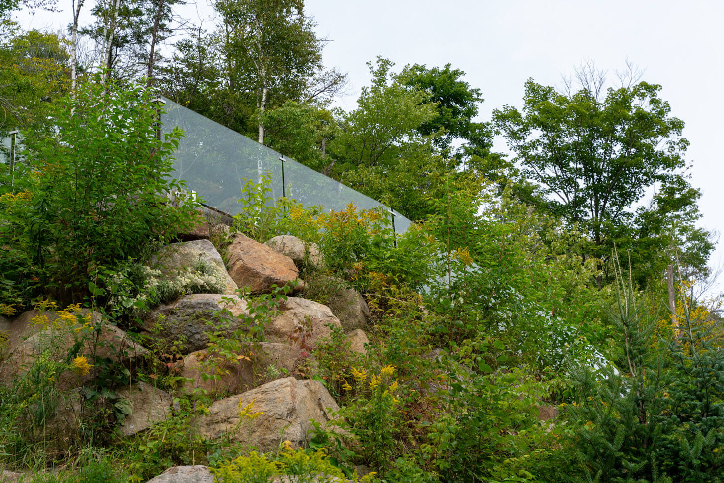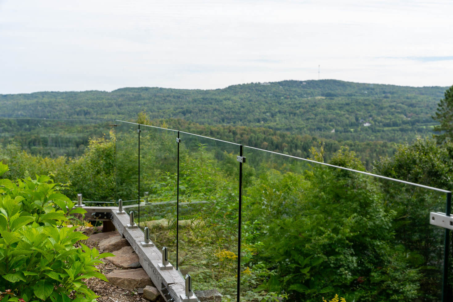 Avec une vue aussi époustouflante sur les Laurentides, le choix de la rampe en verre trempé clair 12mm était le plus évident. Cette option reste la meilleure pour conserver votre vue sur la nature et les horizons tout en sécurisant votre espace. Pour garder un look doux, épuré et subtil, nous avons attaché les verres avec des spigots en acier inoxydable.